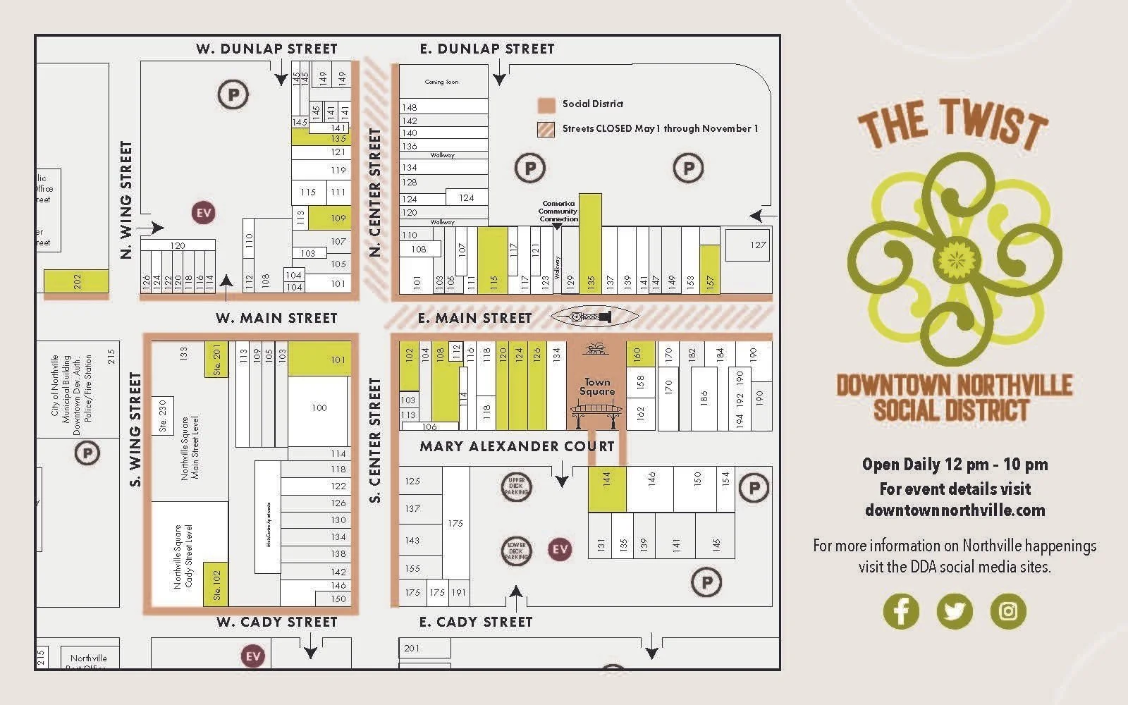 Created as a way to keep Downtown Northville vibrant during the pandemic and beyond, "The Twist" has become a favorite for businesses and visitors alike. Enjoy Michigan's weather in all seasons in specially designated areas currently closed to vehicular traffic. The Twist encompasses Town Square as well as Main St. between Wing and Hutton, and Center St. between Dunlap and Cady.